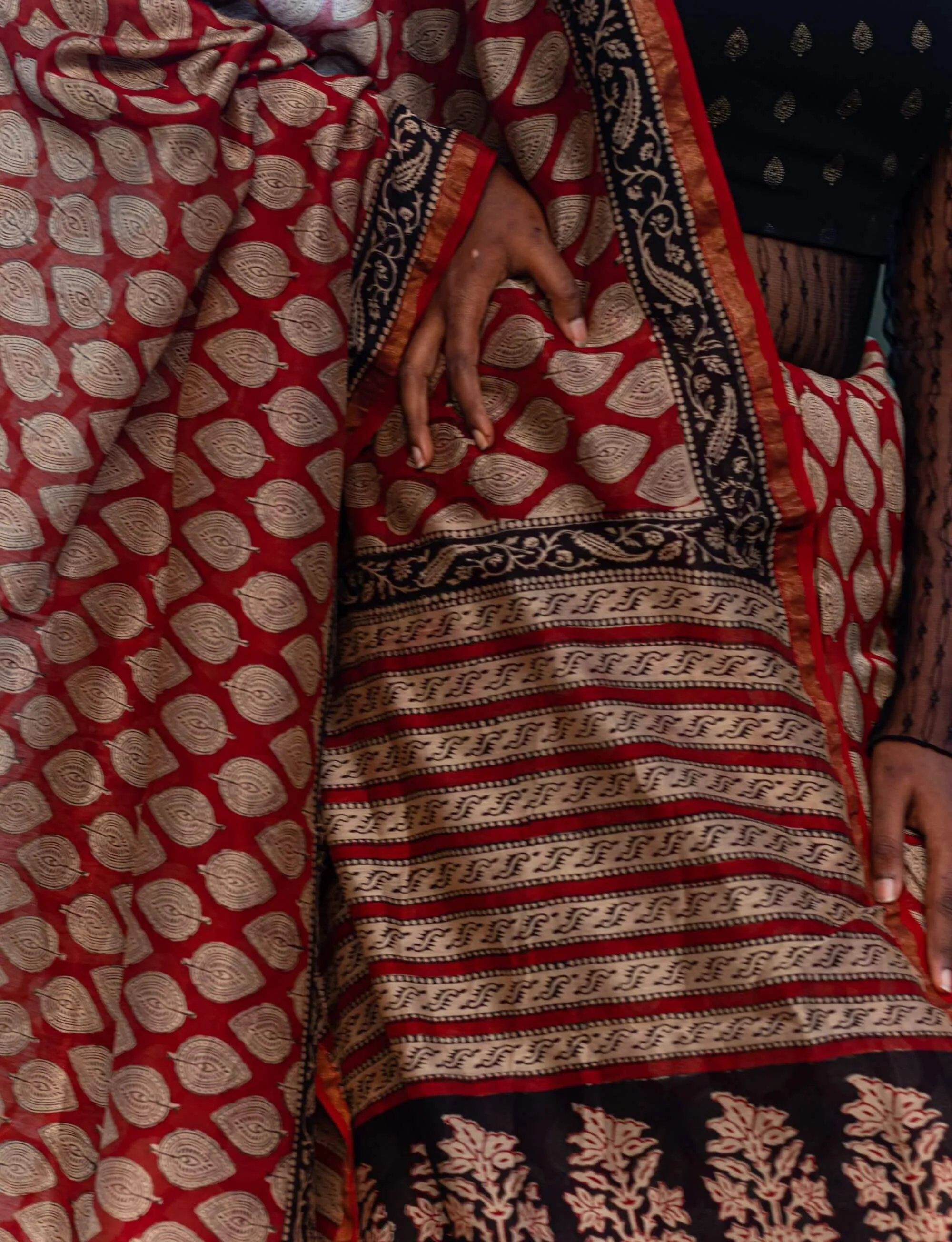 - Fabric: Handloom silk cotton, block-printed with natural vegetable dyes.