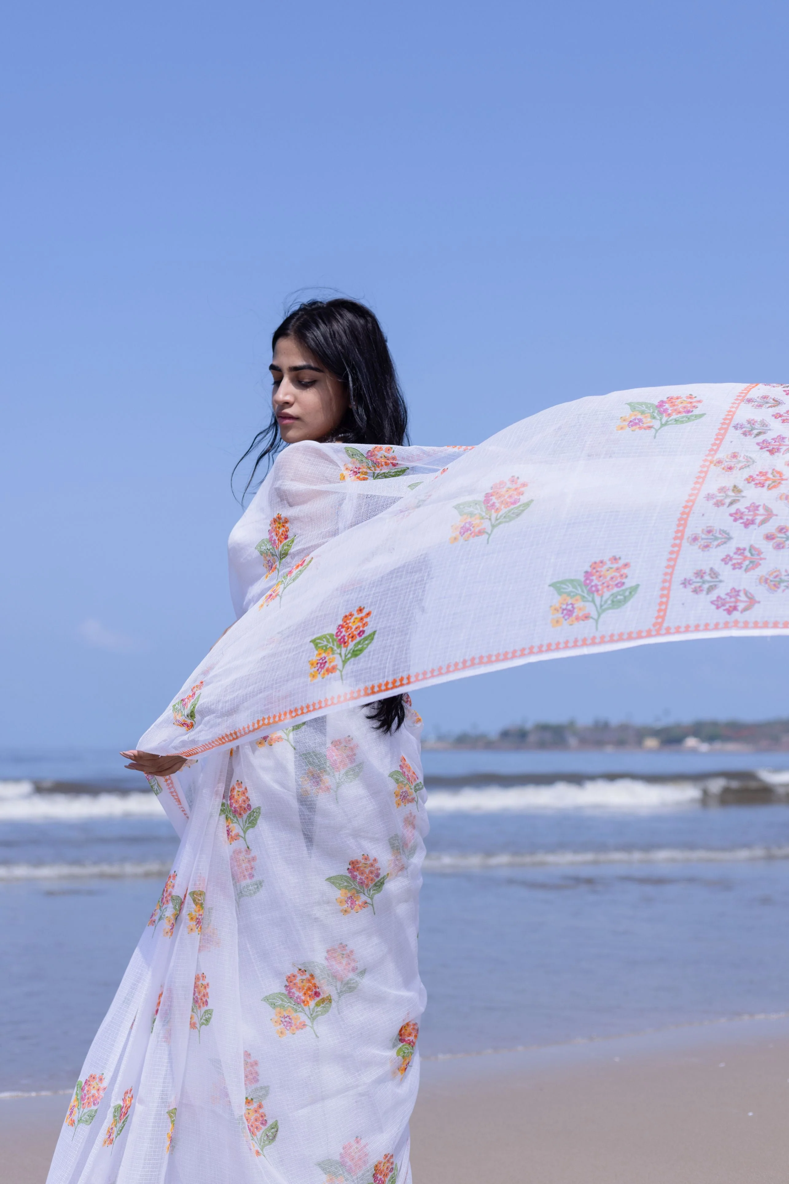 Our Kota range is truly one of a kind. Inspired by the gentle touch of a summer breeze over an ethereal lake, these sarees are masterfully woven by the karigars of Kaithoon and elegantly adorned with Sanganeri block prints on the borders and body, creating a chic and captivating drape story.