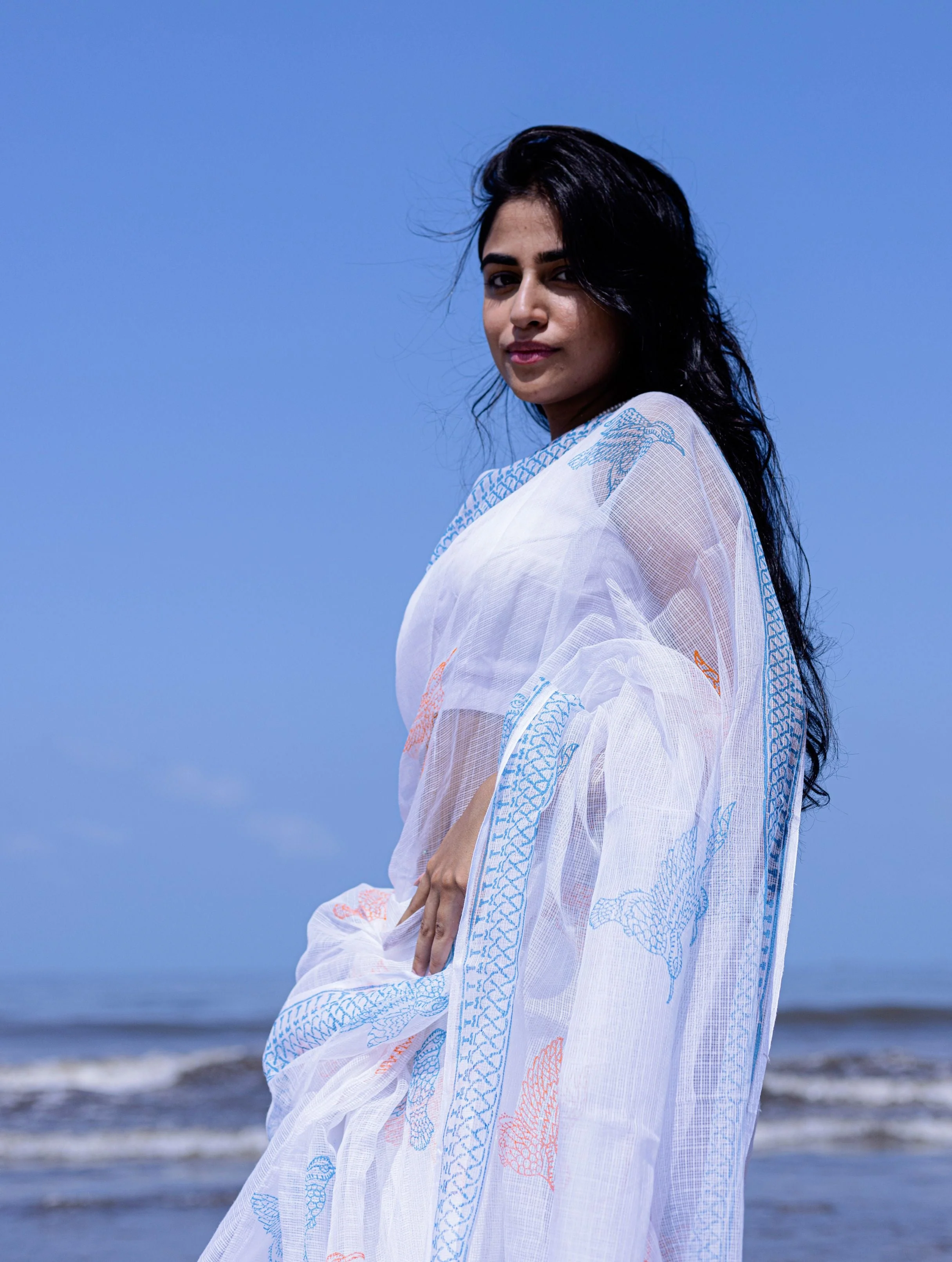 - Material: Handwoven Kota Doria (silk-cotton), hand-block printed with azo-free dyes.