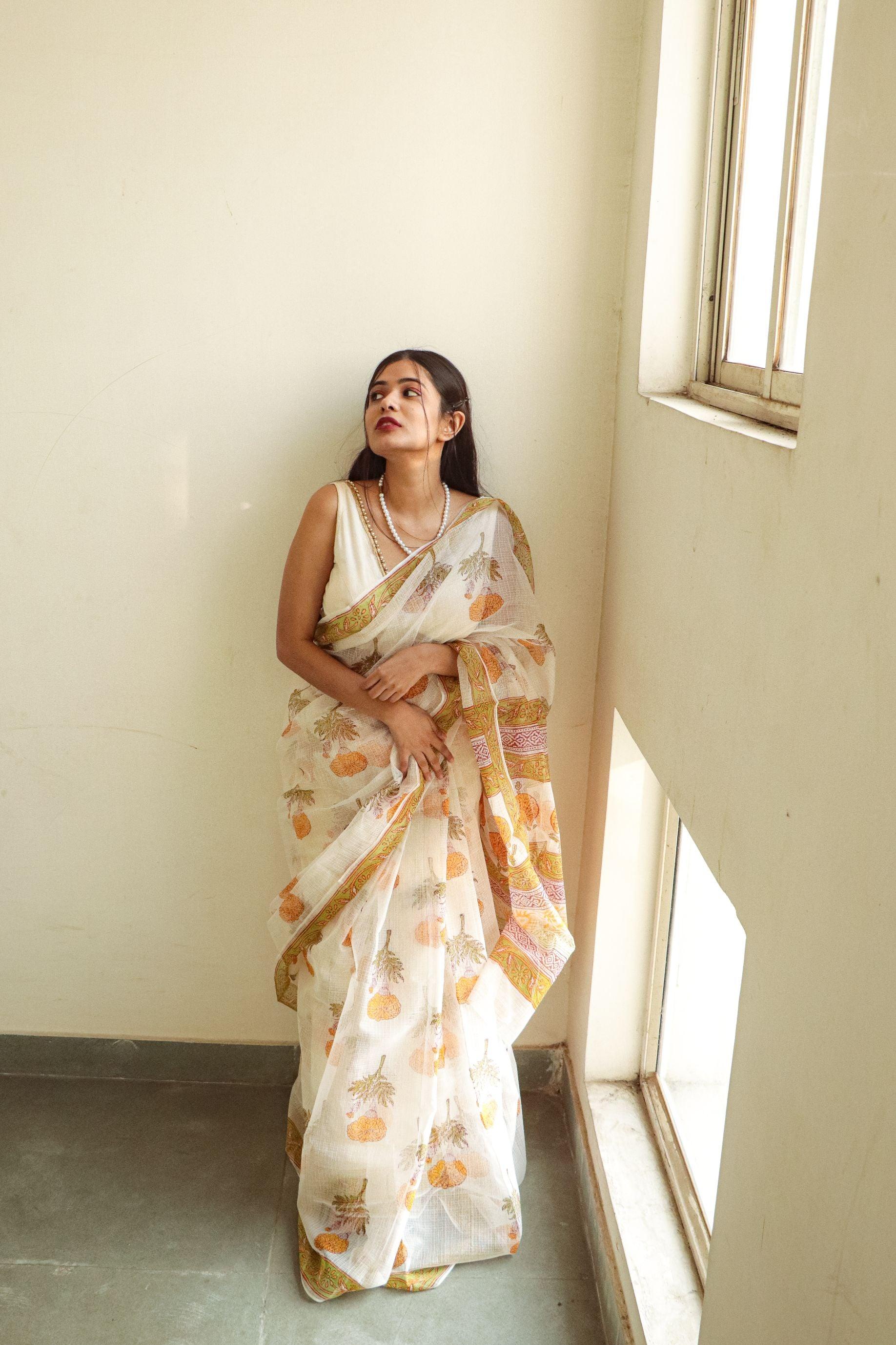 - Material: Handwoven Kota Doria (silk-cotton), hand-block printed with azo-free dyes.