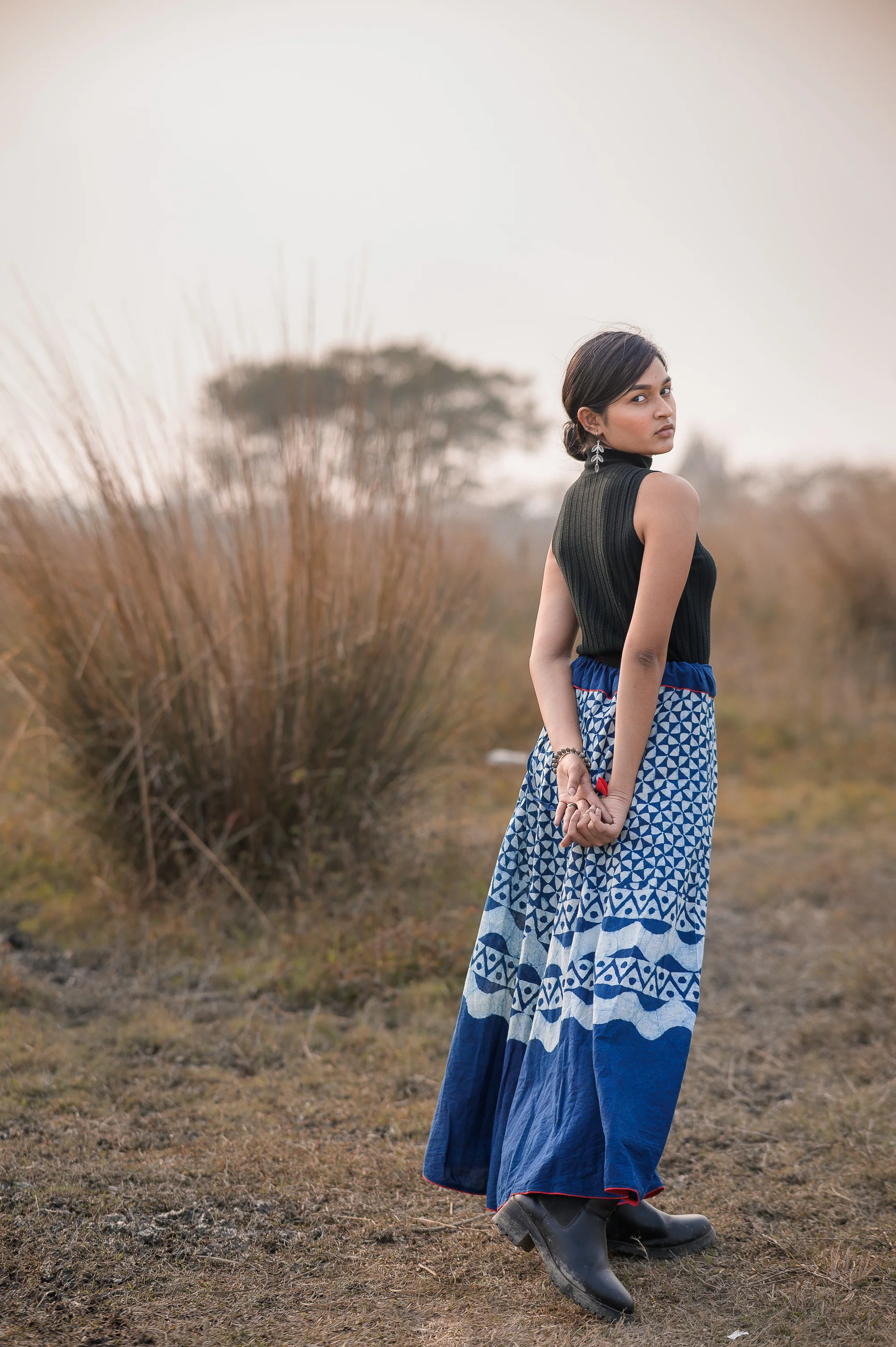 Fabric: Handwoven and handspun soft Mulmul (cotton), hand-block printed with mud-resist Indigo dye.