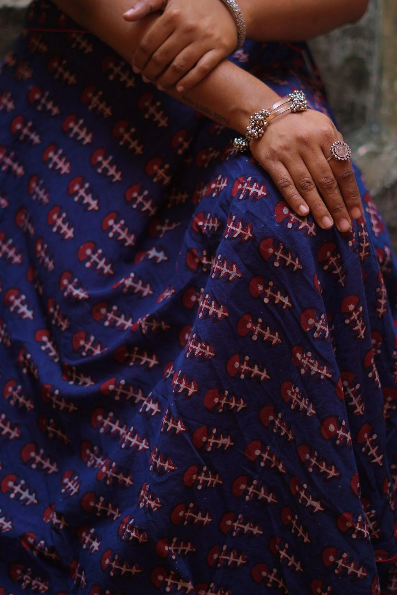 Fabric: Handwoven and handspun soft Mulmul (cotton), hand-block printed with mud-resist Indigo dye.