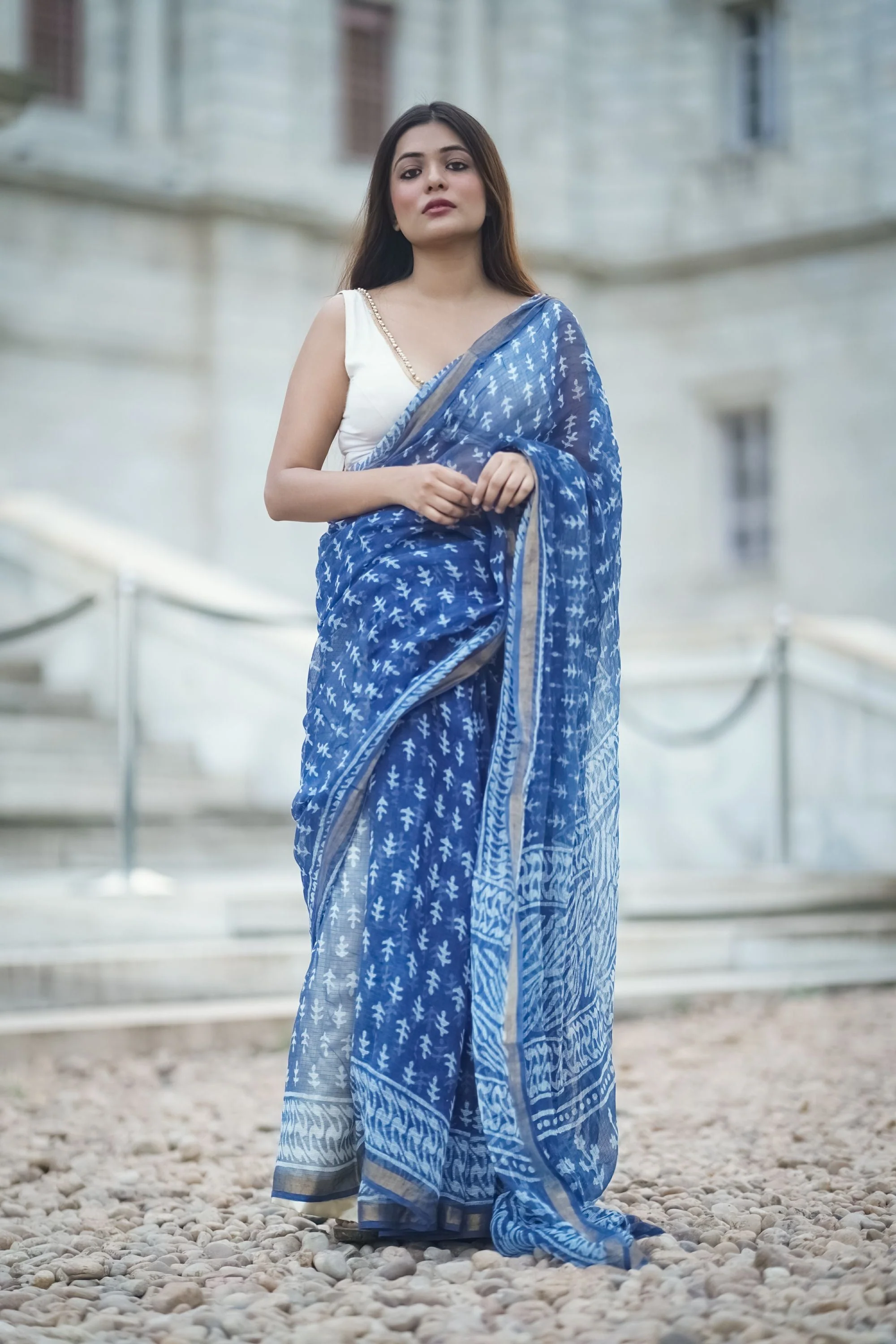 Our Kota range is truly one of a kind. Like the summer breeze on an ethereal lake, it is woven by the karigars of Kaithoon and interlaced with Dabu block printing on the borders and body to craft this chic new drape story.