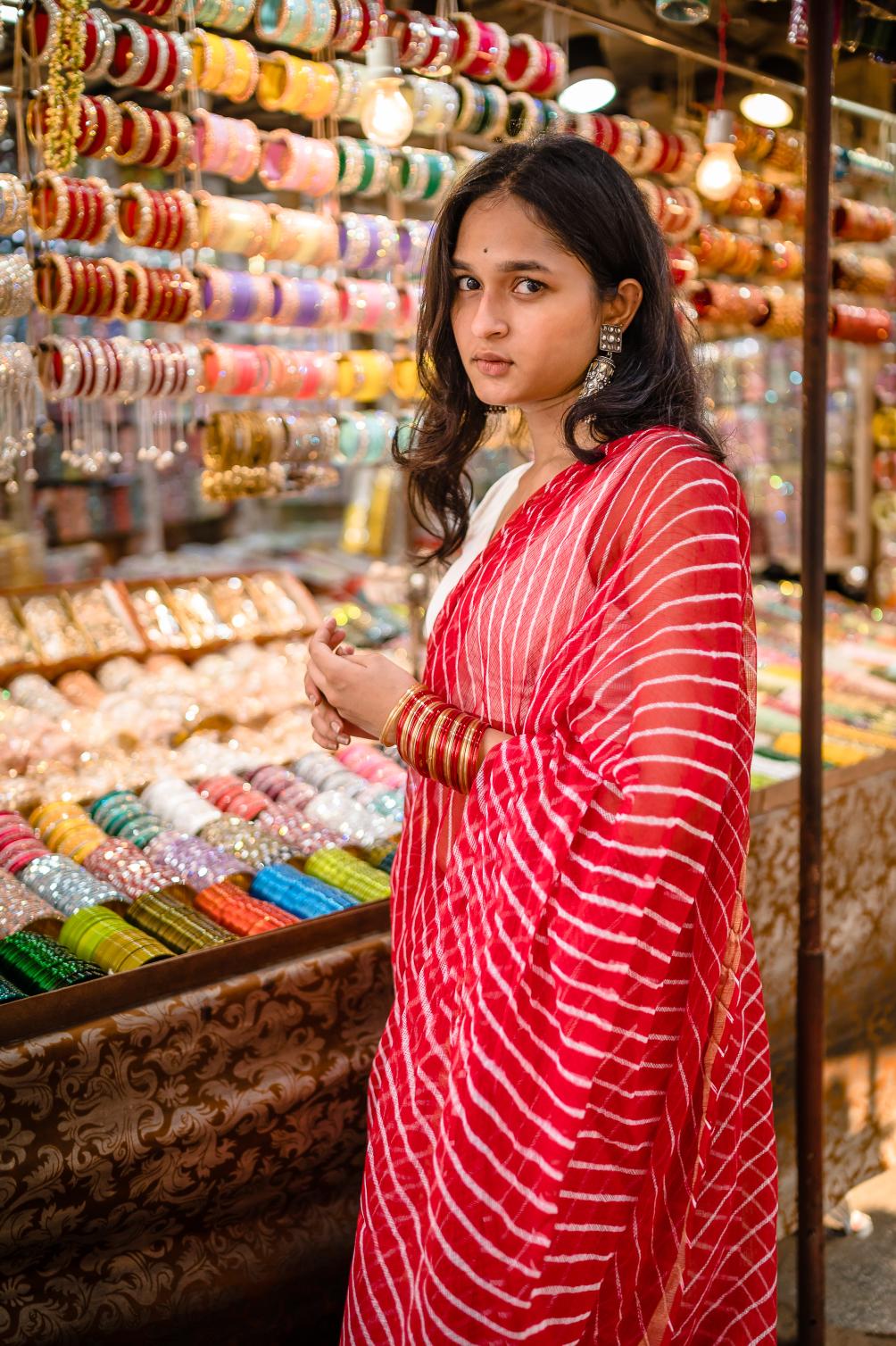 Leheriya is a traditional tie-and-dye technique that originated in Rajasthan. The word "Leher" means "waves." The fabric is diagonally folded and tied with thread before being immersed in dye, and the resist is removed to reveal beautiful diagonal stripes.