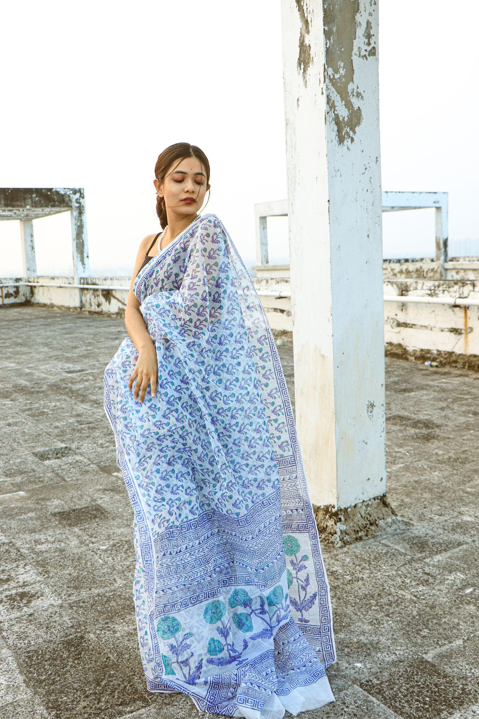 - Material: Handwoven Kota Doria (silk-cotton), hand-block printed with azo-free dyes.