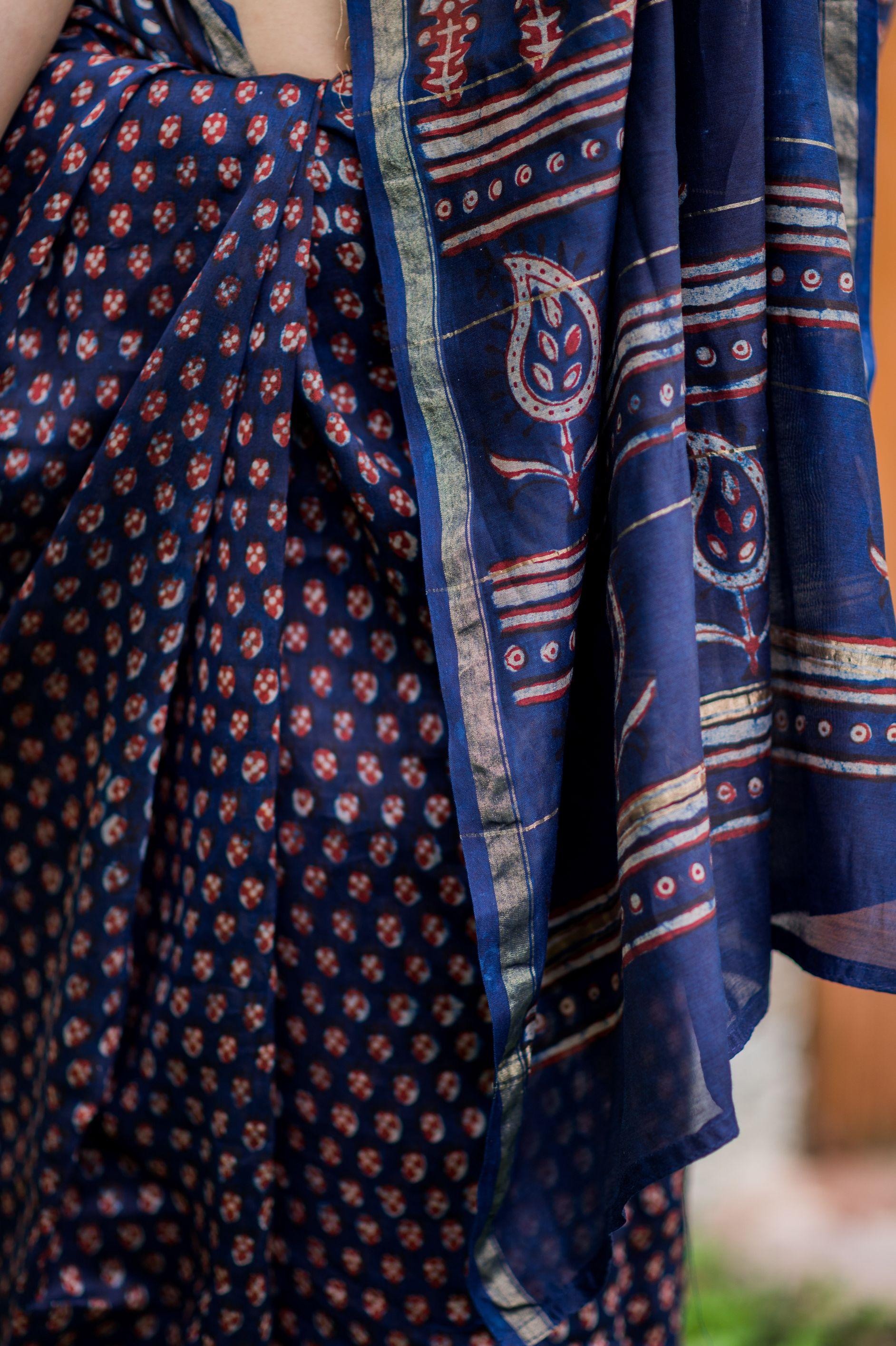 Fabric: Silk cotton saree, hand-block printed with natural Indigo dye, intermixed with Pharad print.