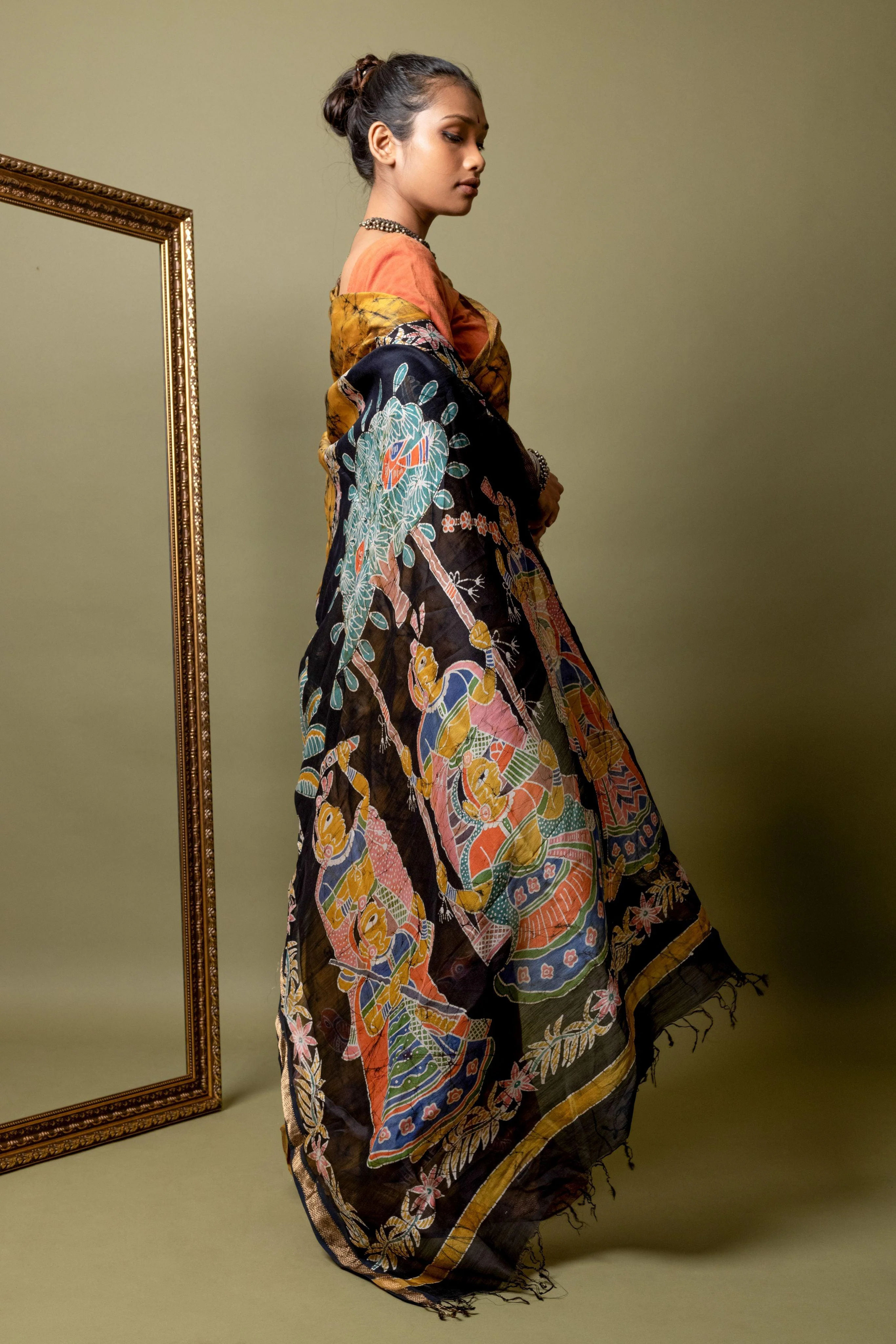 - Art: Hand-painted Batik inspired by Gond tribal motifs, crafted with azo-free dyes
