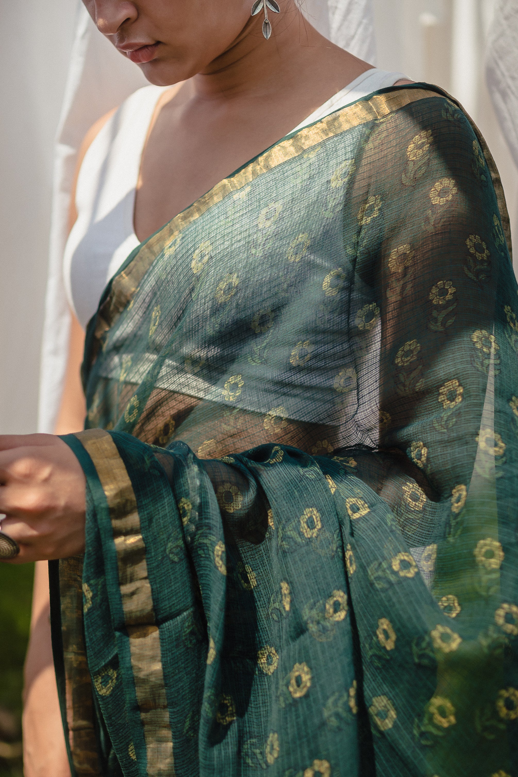 Our Kota range is truly one of a kind. Like the summer breeze on an ethereal lake, it is woven by the karigars of Kaithoon and interlaced with Dabu block printing on the borders and body to craft this chic new drape story.