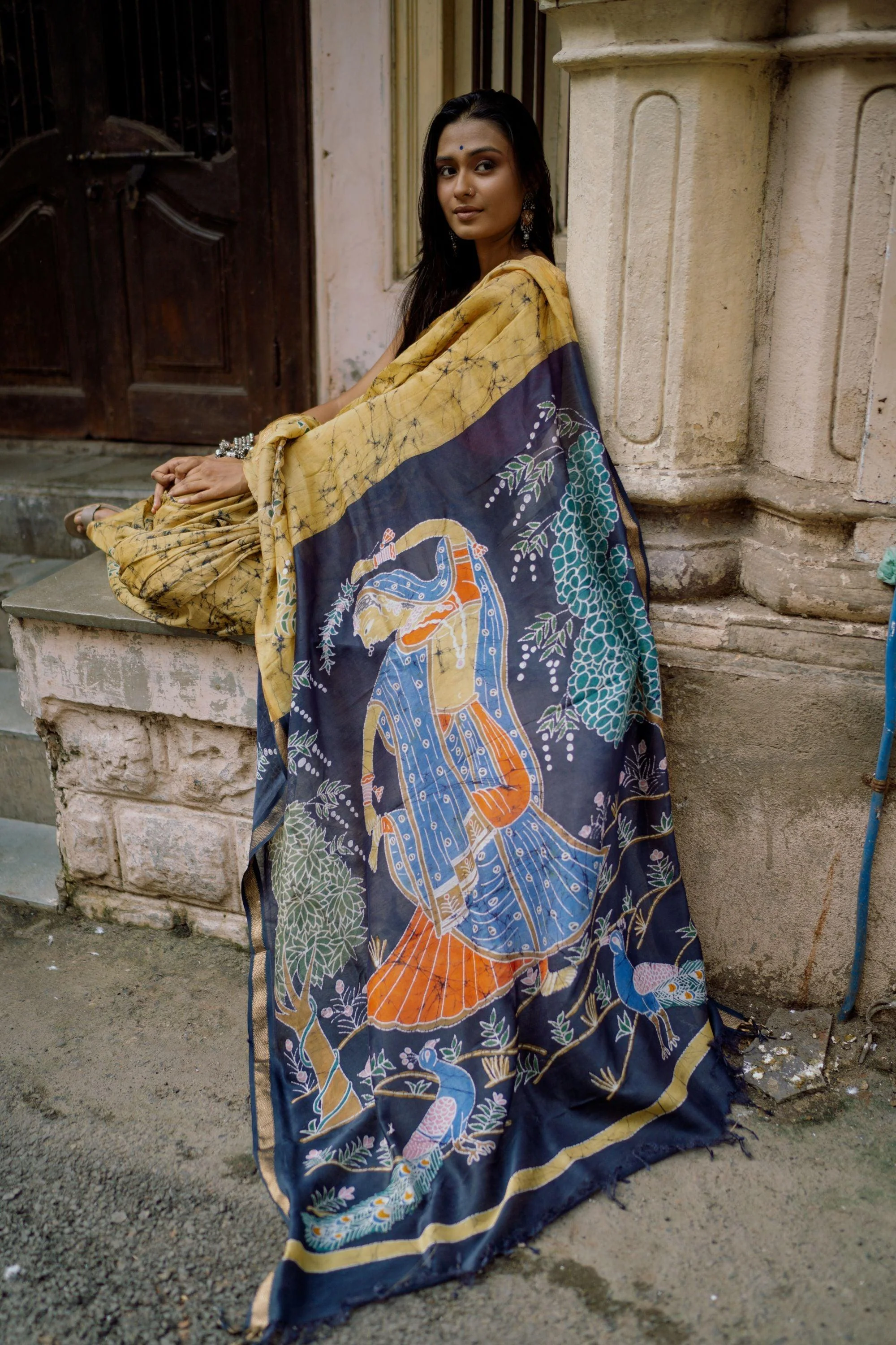 - Art: Hand-painted Batik inspired by Gond tribal motifs, crafted with azo-free dyes